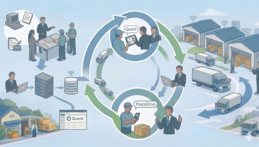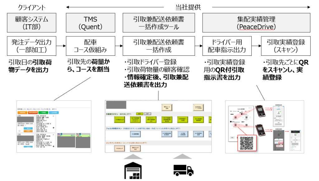 そこで当社は、業務設計と引取物流用システム(Quent/PeaceDrive)の提供にとどまらず、コンサルタントが伴走して複数回のPoC(概念実証)を実施した。段階的に現場への定着を推進し、検証途中で生じた課題にも実態に合わせてタイムリーに対応。さらに、今後引取先が増加しても現場の負荷が上がらないよう、既存システムと連携するためのデータ変換ツールも並行して作成・提供した。